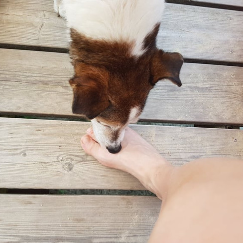 Was ich dafür mache? Den kleinen Terrier zu wunderbarer Distanzlosigkeit verleiten und diese dick belohnen. Immer öfter dienen in bereits bekannten Übungen Füße und Beine als Belohnungs-Abholort, öfter gebe ich ihm Gelegenheit, sich seine Belohnungsstückchen erfolgreich zu mopsen – der Teller steht halt einfach meist bei meinen Füßen herum.