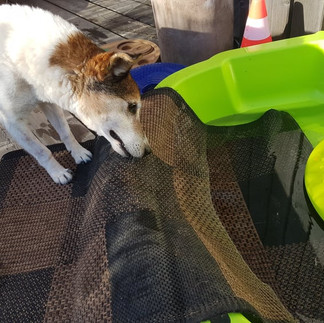 Neues wird immer noch im vom Terrier gewählten Abstand präsentiert, meist mit der Möglichkeit, sich selbstständig anzunähern und etwas Gutes abzuholen – und der Zweiten, es sein zu lassen, und mit etwas Anderem an eine Belohnung zu kommen.