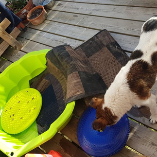 Wir haben mit ganz kleinen, leichten Hindernisstrecken begonnen, aus denen sich Gildin nach Gutdünken seine Wurststückchen abholen konnte – so begann er, sich überlegter zu bewegen, selbst wenn er ein Gerät nur umschiffte.